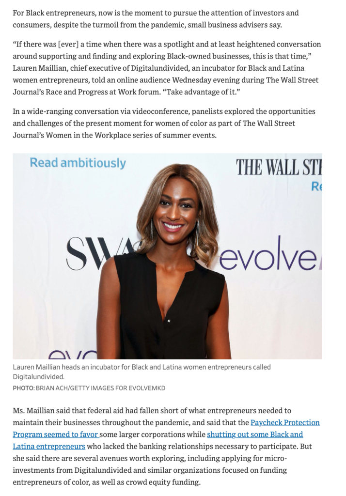 “If there was [ever] a time when there was a spotlight and at least heightened conversation around supporting and finding and exploring Black-owned businesses, this is that time,” Lauren Maillian, chief executive of Digitalundivided, an incubator for Black and Latina women entrepreneurs, told an online audience Wednesday evening during The Wall Street Journal’s Race and Progress at Work forum. “Take advantage of it.”